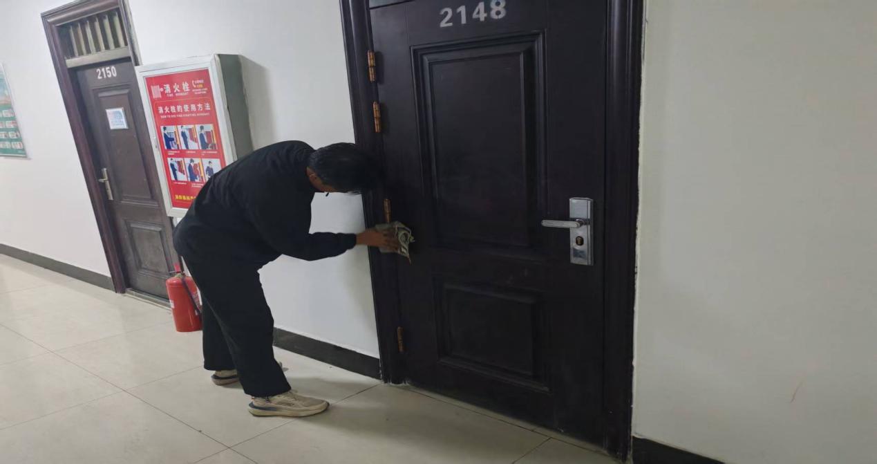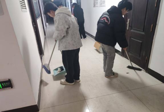 活动中,学生们分组承包公寓楼门厅、楼梯间及公共洗衣房区域:有的用扫帚清扫楼梯台阶缝隙灰尘,有的拿抹布擦拭门厅公告栏与扶手,还有的整理洗衣房内摆放杂乱的洗衣机盖、清理地面水渍。大家相互配合,不放过任何卫生死角。
