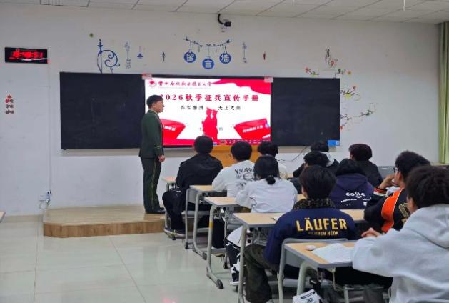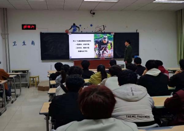宣讲现场,学生干部给同学们发放征兵宣传手册,退役军人结合军旅生涯亲身经历,用朴实语言讲述军营锤炼成长、保家卫国的故事,细致解读大学生入伍条件、流程及学费补偿、考研加分、就业扶持等优待政策,现场答疑解惑。辅导员老师给同学们讲述宣传优秀入伍学子武承环提干的事迹。