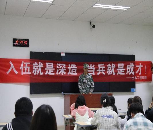 近日,土木工程学院特邀优秀退役军人走进班级晚自习课堂,开展征兵主题宣讲,点燃学子参军报国热情。